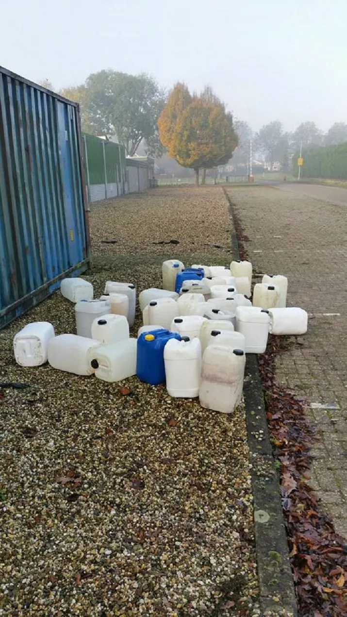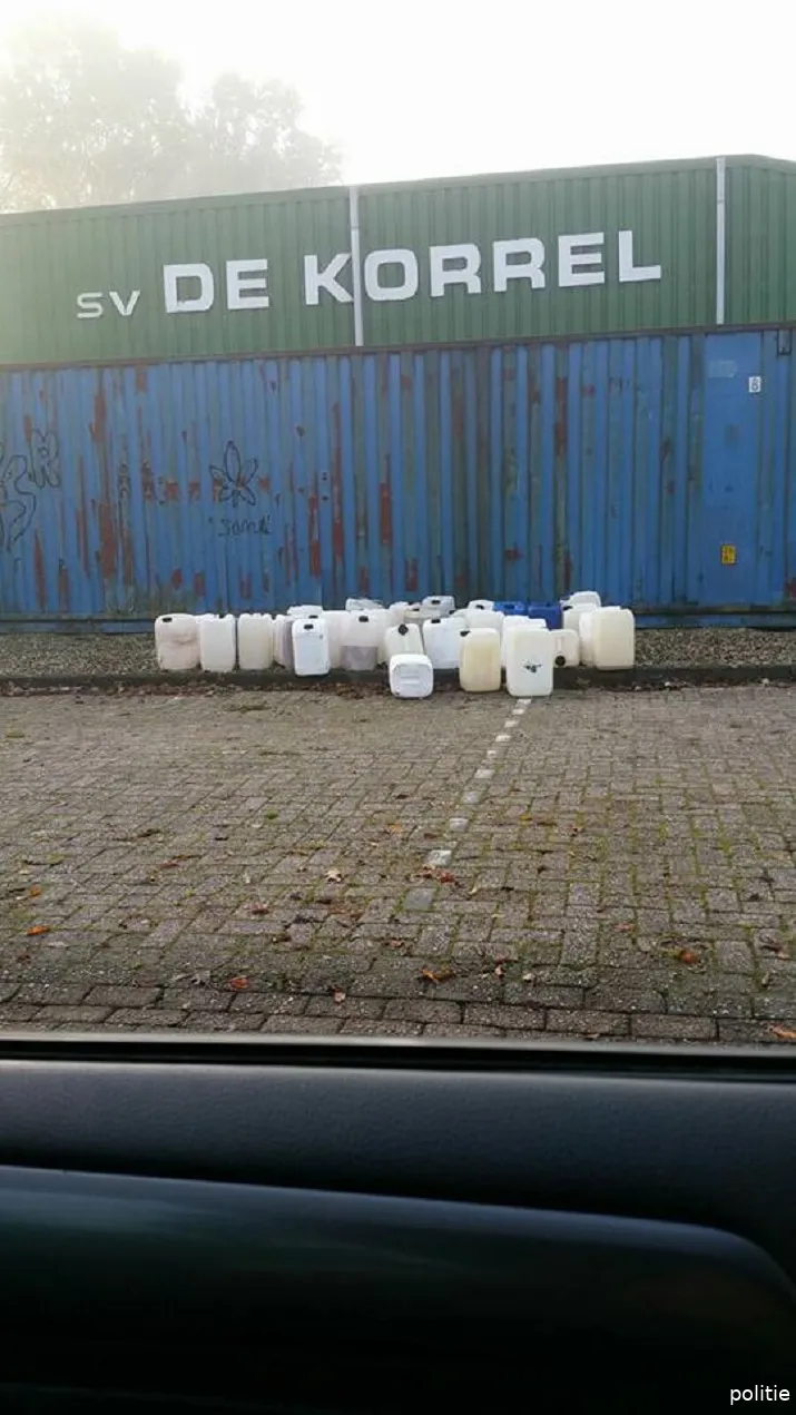 Toen agenten daar ter plaatse kwamen zagen ze ongeveer 39 jerrycans liggen. Sommige waren gevuld en een aantal leeg. Het is nog onbekend welke vloeistof er in de vaten zat.