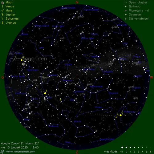 Ga rond 19.00 uur naar buiten en kijk naar het zuiden. Helemaal links, iets achter je, zijn Mars als heldere rode ‘ster’ en de Maan te zien. Links voor je, in het zuidoosten, zie je de heldere Jupiter. Uranus is daar ook te zien, maar alleen met een verrekijker. Rechts voor je, in het zuidwesten kun je met een telescoop Neptunus vinden. Diezelfde kant ook vind je ook een zwakke Saturnus en een zeer heldere Venus.